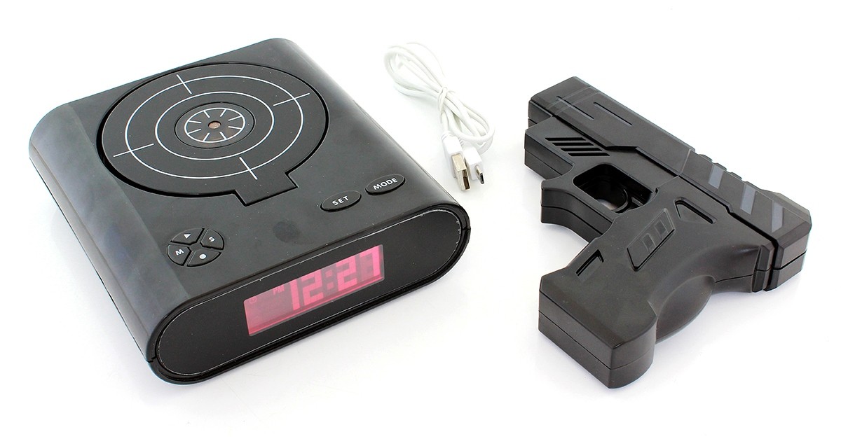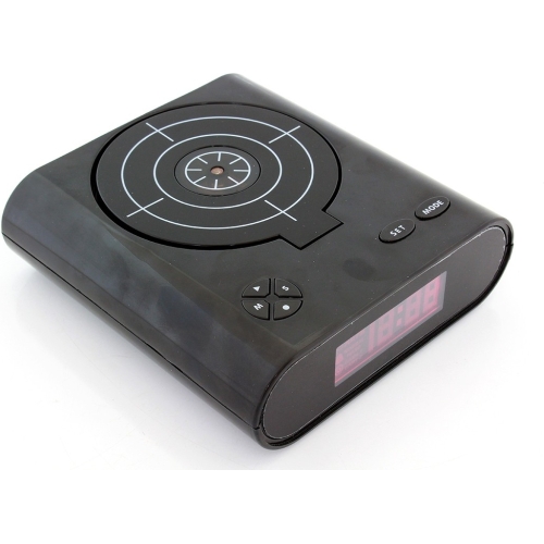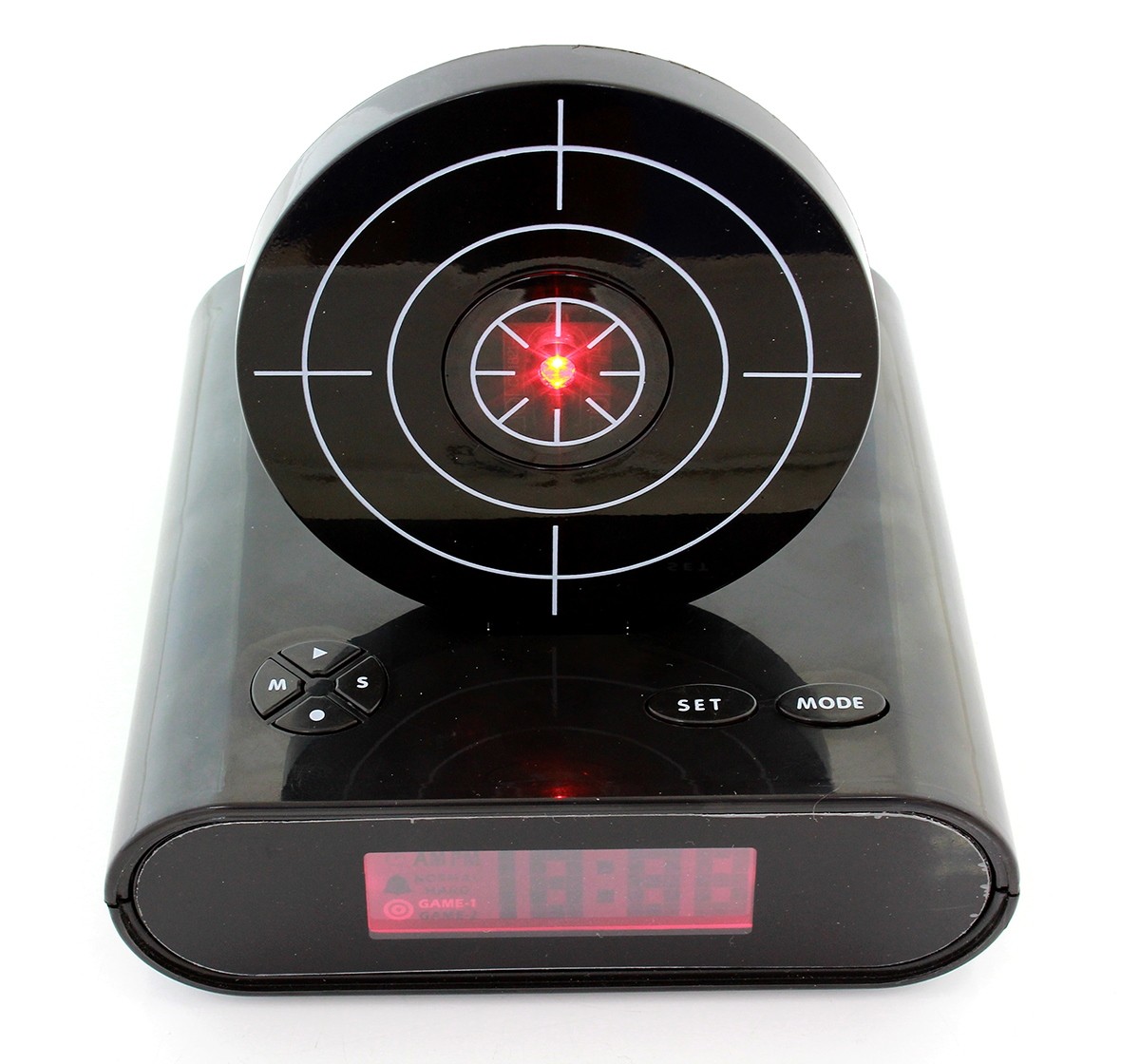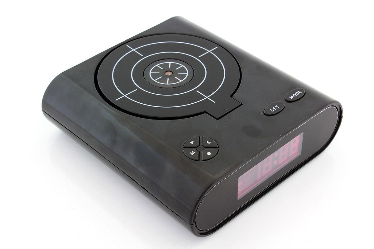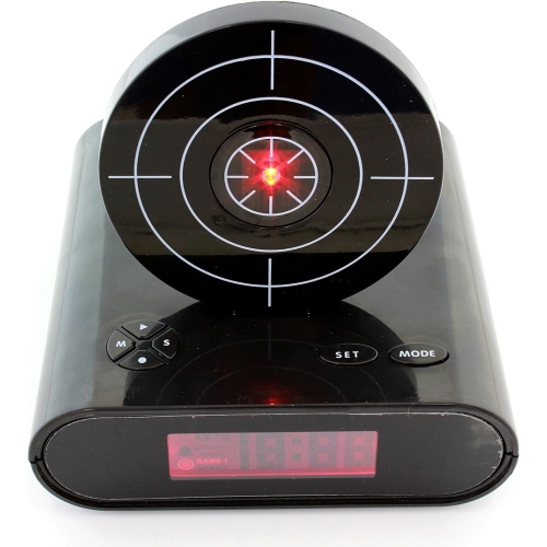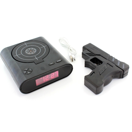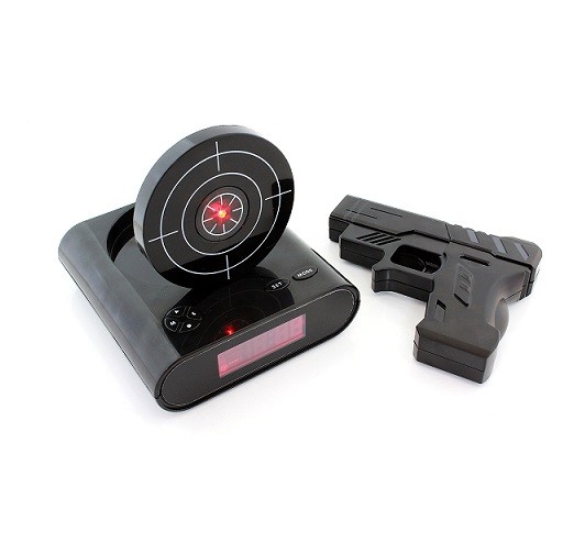Are un design inedit pentru un ceas desteptator. Cand suna alarma, tinta se ridica si aceasta poate fi oprita numai daca indreptati pistolul in directia tintei.