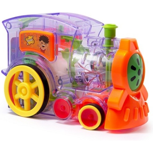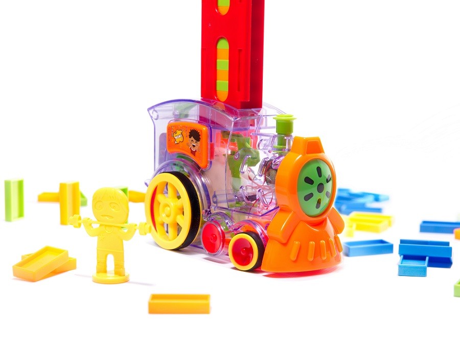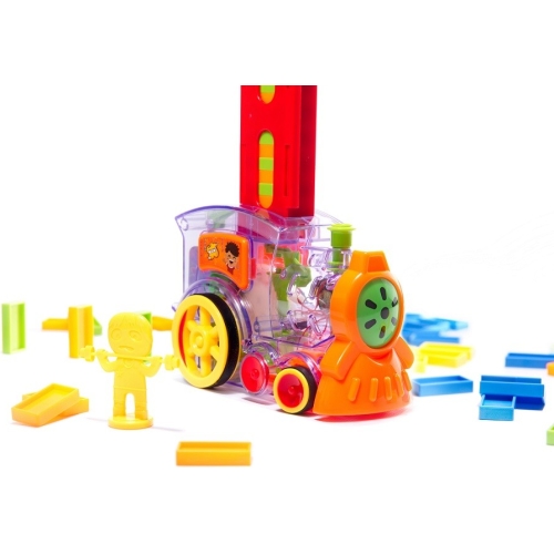 O locomotiva interactiva colorata care aranjeaza blocuri de domino.