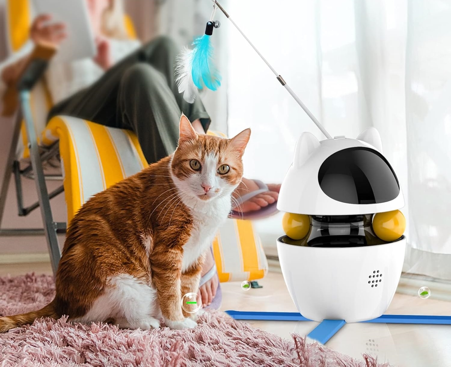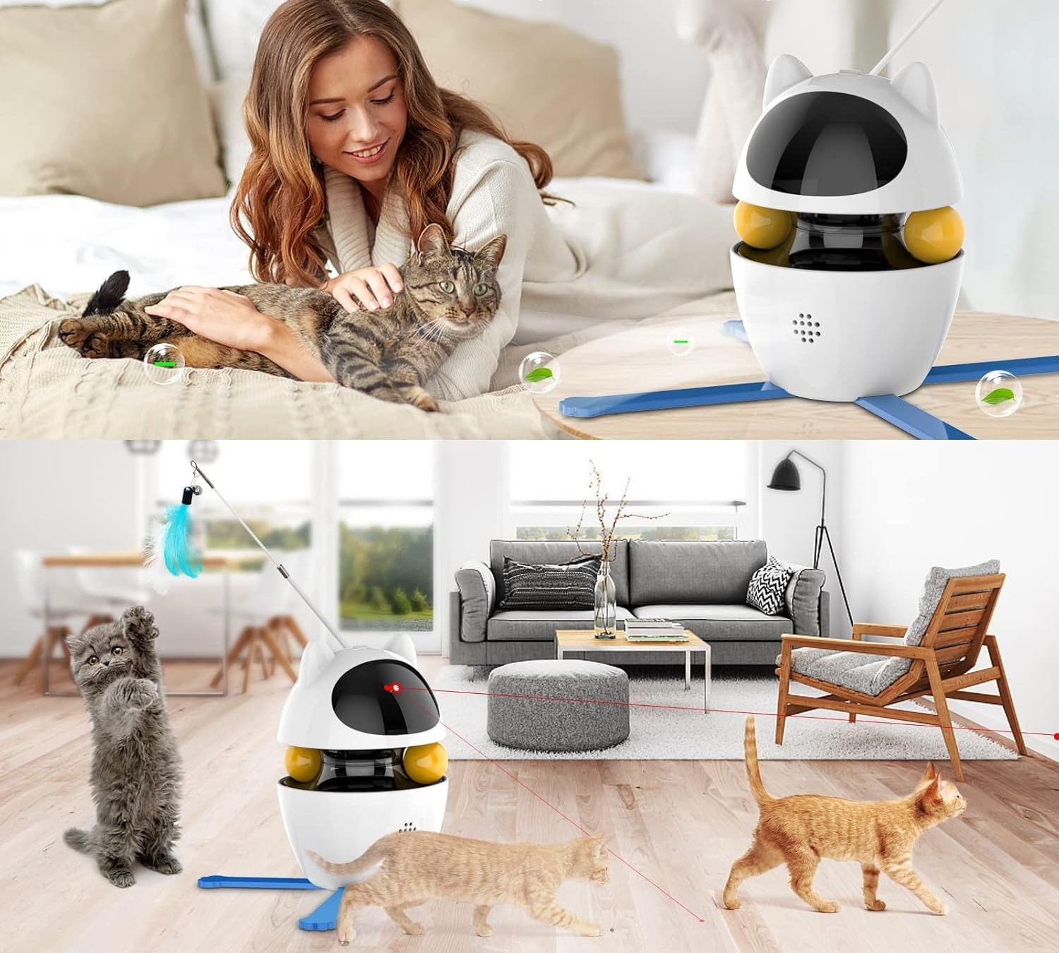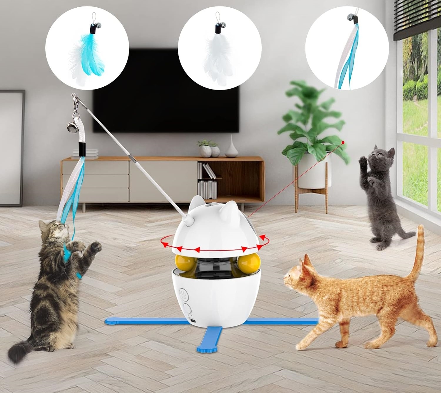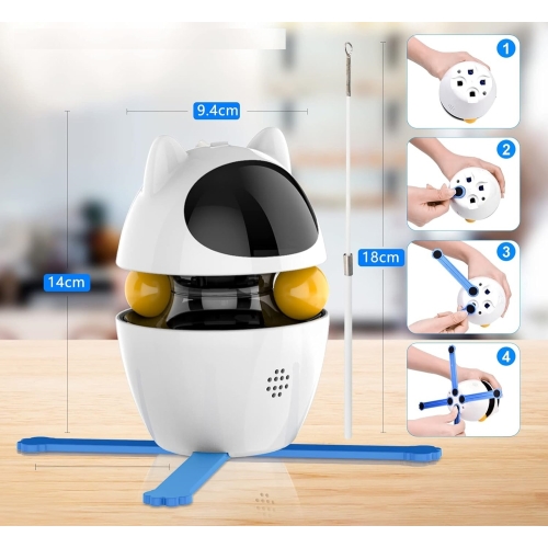 Pe lângă laser și pene, jucăria include mingi rotative, concepute pentru a stimula dexteritatea și agilitatea pisicii. Privind cum încearcă să captureze mingile, vei observa cum aceasta își îmbunătățește coordonarea și abilitățile motorii.