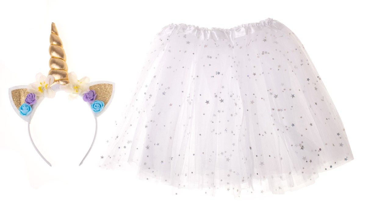 Tinuta de carnaval cu bentita de unicorn si fusta alba de printesa acoperita cu stele stralucitoare.