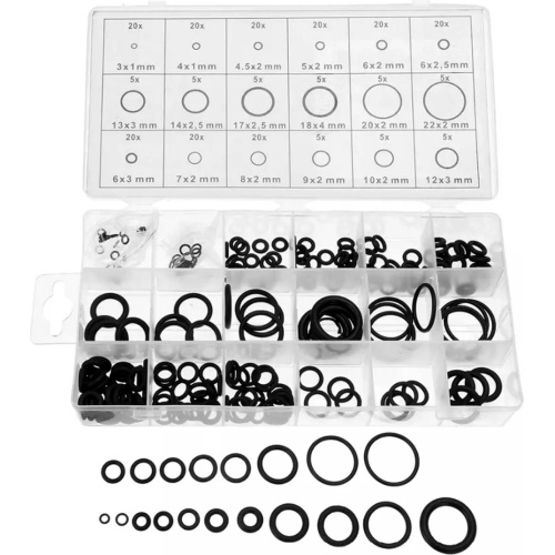 Acest produs este un set de 225 de garnituri oringuri din cauciuc rezistent la ulei. Garniturile sunt rezistente la uleiuri de motor si minerale, grasimi, combustibili de motor, diferite tipuri de emulsii ulei-apa si ozon. Setul include o carcasa practica cu compartimente cu o descriere a tuturor inelelor O.