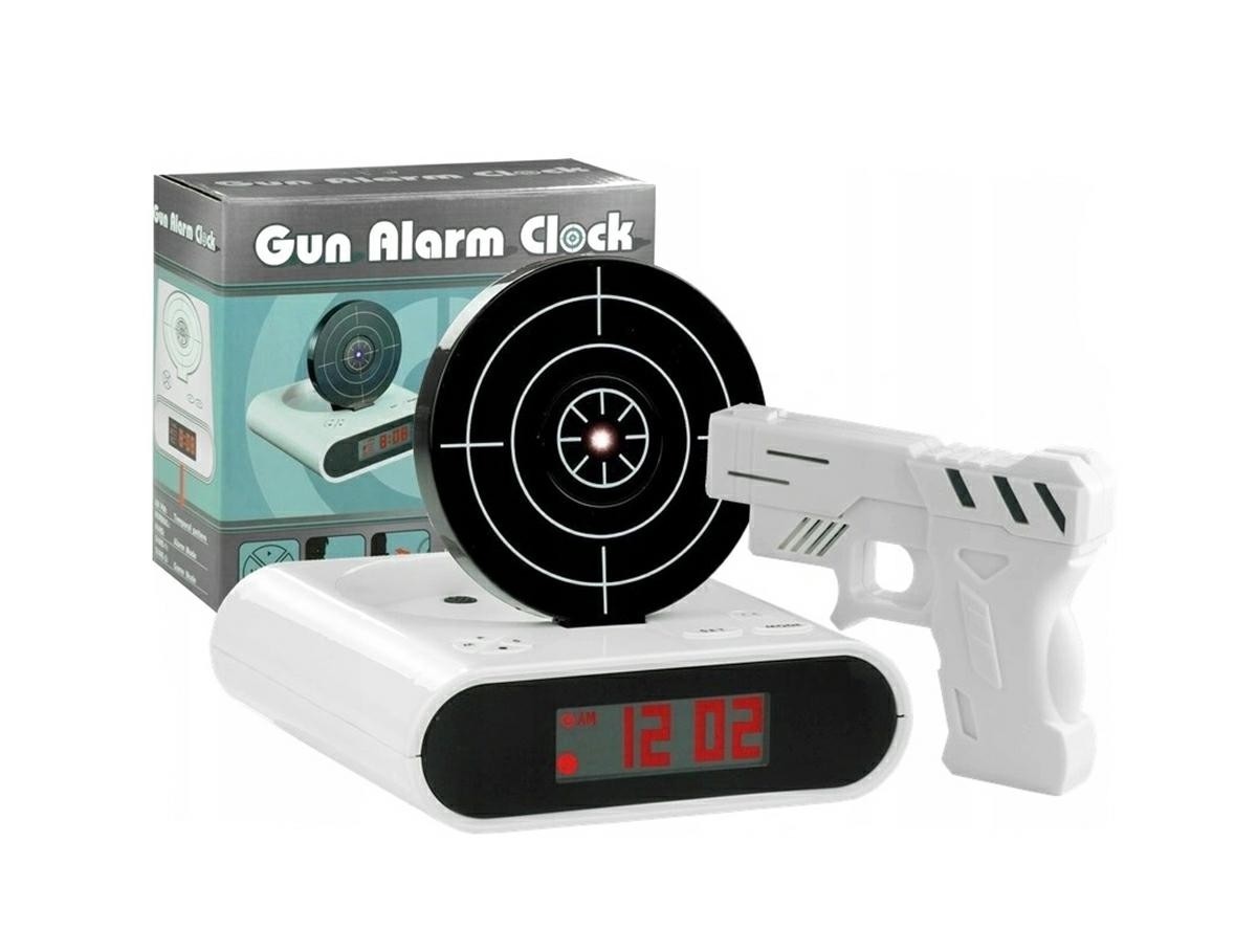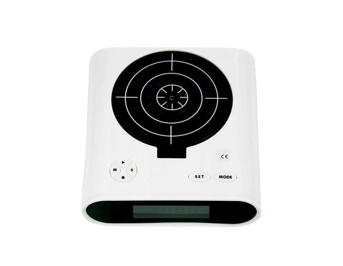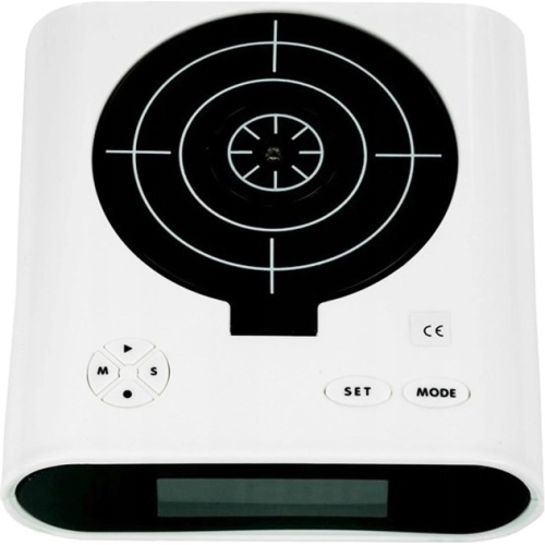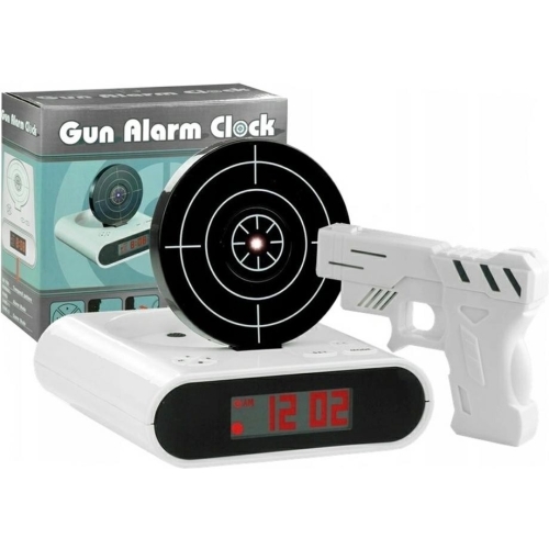 Are un design inedit pentru un ceas desteptator. Cand suna alarma, tinta se ridica si aceasta poate fi oprita numai daca indreptati pistolul in directia tintei.