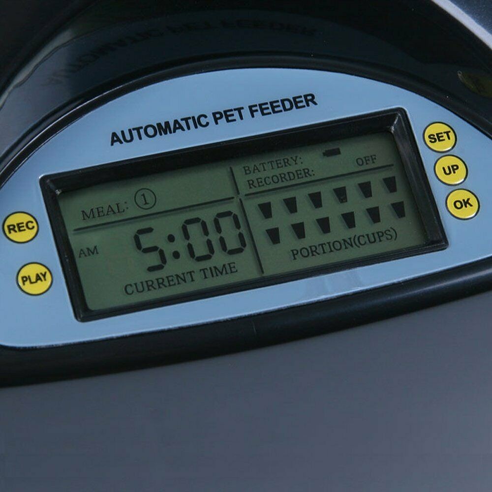 Cu acest hranitor de mancare automat, puteti inregistra vocea timp de 10 secunde si atunci cand programati mesele, la fiecare masa se va repeta vocea dumneavoastra de 3 ori.