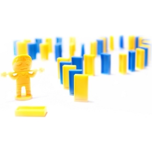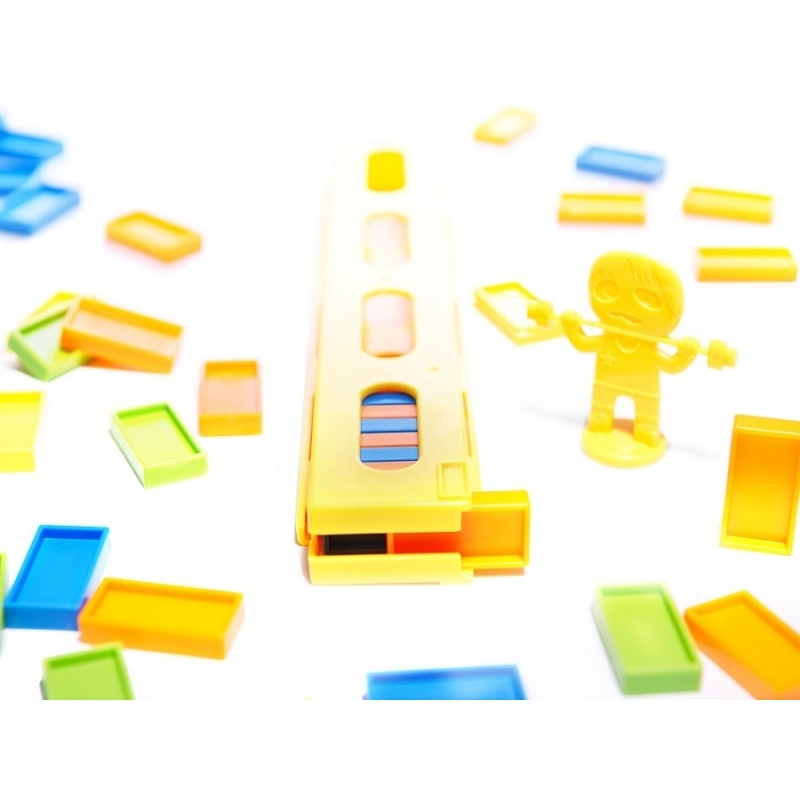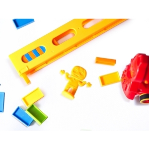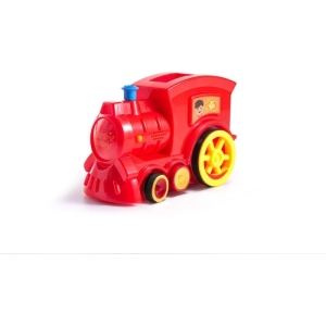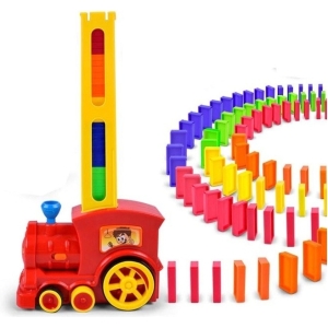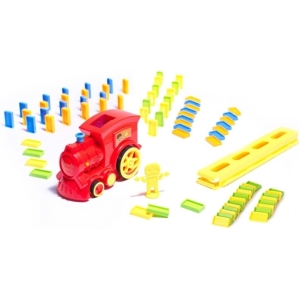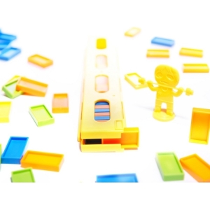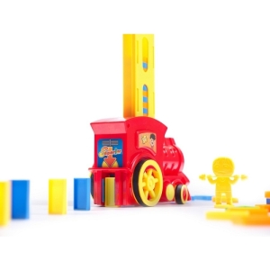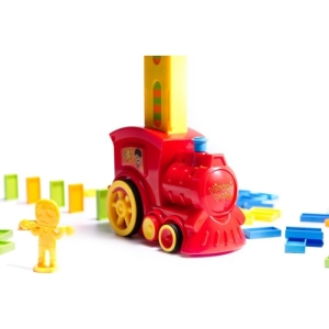 O locomotiva interactiva colorata care aranjeaza blocuri de domino.