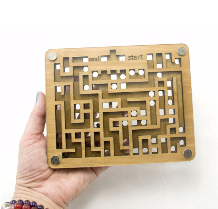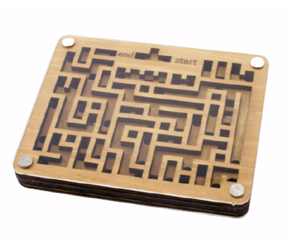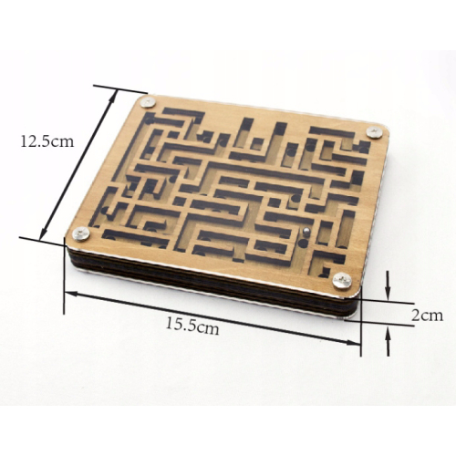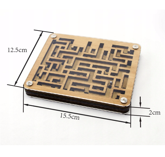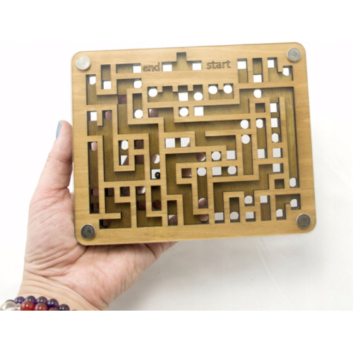 Jocul este solid, din lemn masiv și este compact – este ușor de luat cu tine, de exemplu într-o călătorie. Scopul jocului este de a conduce mingea de metal de la punctul de plecare până la linia de sosire, astfel încât să nu cadă în găuri. Nu putem manevra decât cu două butoane pe laturile labirintului.
