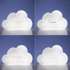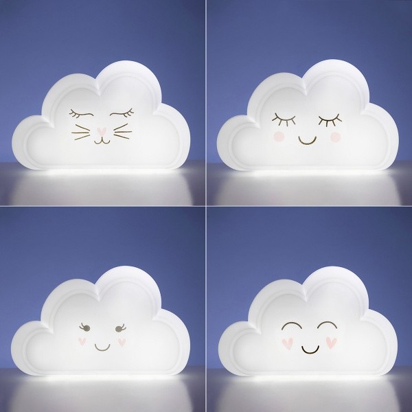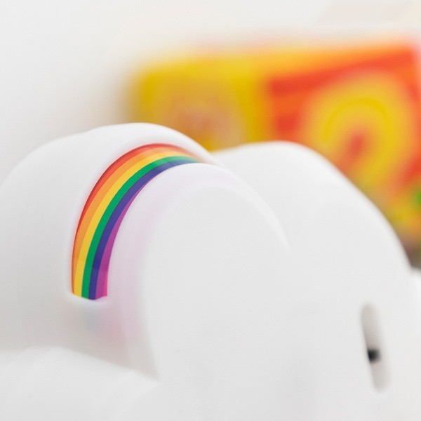 Lampa are forma unui nor si emite lumina alba, iar pe spate proiecteaza un curcubeu pe perete.