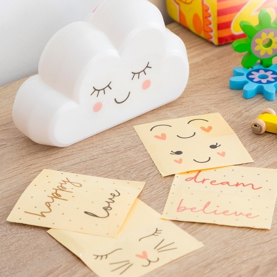 Setul include 8 autocolante decorative reutilizabile, datorită cărora cei mai tineri membri ai gospodăriei își pot personaliza lampa după cum doresc în fiecare seară.