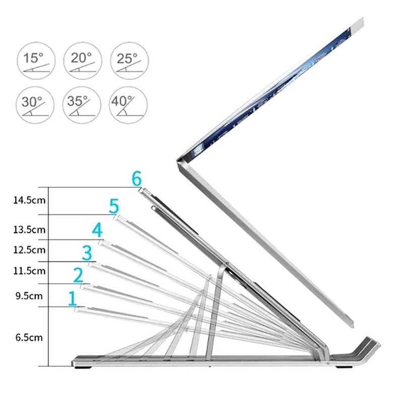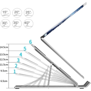 Reglarea in mai multe trepte (6) a inclinarii blatului asigura adaptarea suportului la nevoile utilizatorului. Aceasta este o solutie extrem de ergonomica care mareste confortul utilizarii unui laptop.