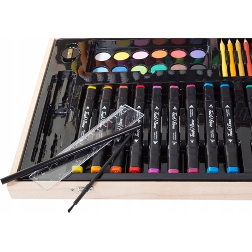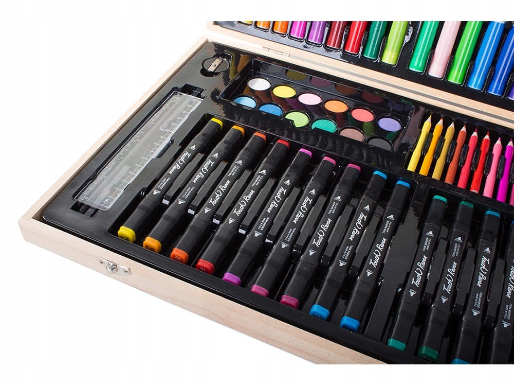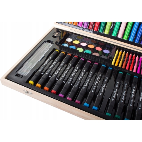 Carcasă practică și portabilă – Toate elementele sunt organizate într-o geantă elegantă din lemn, ușor de transportat și depozitat. Sistemul de închidere cu agrafă asigură protecția accesoriilor, astfel încât creioanele și markerele preferate să fie mereu în stare perfectă.
